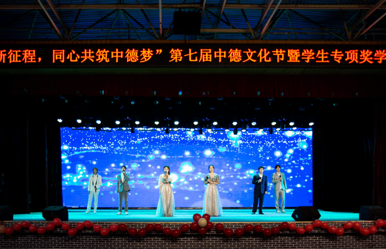 活動在開場舞《盛世歡歌》輕盈靈動、熱烈奔放的舞姿中正式拉開序幕。“夢想啟航”、“青春律動”、“奮斗不息”三大篇章以歌曲、舞蹈、小品、朗誦、器樂等豐富的形式展現(xiàn)中德文化交流互鑒,體現(xiàn)中德學(xué)子自信自強(qiáng)、與時俱進(jìn)的精神風(fēng)貌。演出伊始,一首《陽光男孩》器樂演奏振奮人心;民舞《碇步橋》如天上一輪春月,水袖如輕云般慢移,旋風(fēng)般疾轉(zhuǎn),舞出了中華民族傳統(tǒng)文化的無限魅力;德方教授帶來的歌曲《雪融花》和中德文詩朗誦《朋友》、《情誼》,“相知無遠(yuǎn)近,萬里尚為鄰,愿我們的友誼天長地久”,“中國有月餅、德國有餅干;中國與德國攜手并進(jìn),文化盛宴我們共同品味”,不僅為中德文化交流架起了友誼的橋梁,也讓大家在詩歌的韻味中感受到中德文化交流互鑒、生生不息。一曲合唱《星辰大海》,熒光棒揮舞、歡呼聲雷動。“夢想啟航”篇章,展現(xiàn)了中德學(xué)子懷揣著堅定的信念和對夢想的執(zhí)著追求。一個個紅色的小精靈在舞臺上翩翩起舞,《紅燈籠》開啟了我們的第二個“青春律動”篇章。小品《誰殺死了周日》贏得滿堂喝彩,當(dāng)我們還在回味精彩之時,歌曲《如愿》和爵士舞《rumor》又帶給我們的別樣的激情與青春的勃勃生機(jī)。“青春律動”篇章,生動詮釋了中德學(xué)子亮麗的青春風(fēng)采、迸發(fā)出豪邁的青春激情。百年征程波瀾壯闊,百年初心歷久彌堅。詩朗誦《祖國,一首唱不完的戀歌》帶我們回顧了祖國風(fēng)光秀美、地大物博,表達(dá)了對祖國的熱愛與敬意。沉醉在詩朗誦抑揚(yáng)頓挫昂揚(yáng)真摯的情感時,古典樂器彈唱《青花瓷》指尖行云流水,明快的節(jié)奏,揚(yáng)長的聲音久久回蕩在會場中。《彩虹》歡唱再次將晚會推向高潮,“奮斗不息”第三篇章,展現(xiàn)了中德學(xué)子與時代奮斗,與境遇奮斗,踔厲奮發(fā),篤行不怠。最后,全體演職人員和工作人員傾情演唱《天下相親與相愛》,在歡快和不舍的旋律中,第七屆中德文化節(jié)暨學(xué)生專項(xiàng)獎學(xué)金頒獎儀式圓滿落下了帷幕。