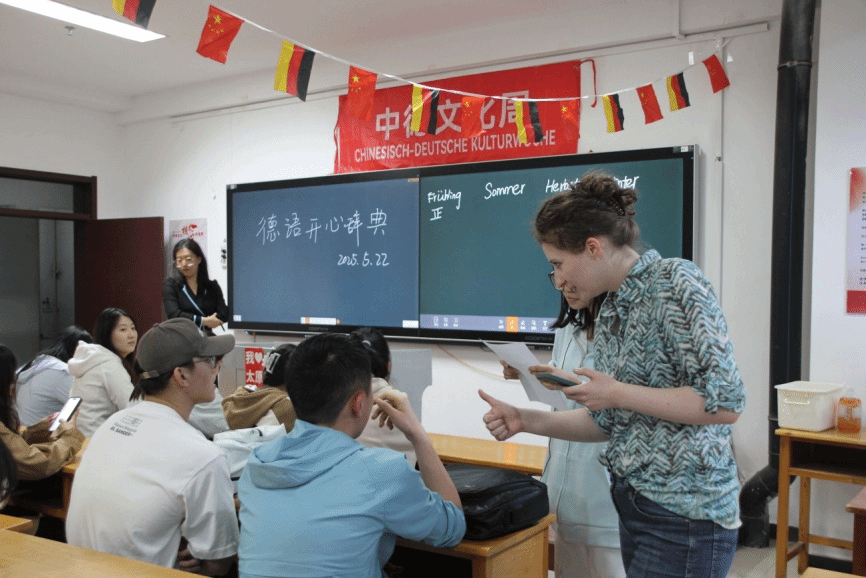 5月22日晚,同學(xué)們齊聚博學(xué)樓727教室,按出生日期分為“春夏秋冬”四支隊(duì)伍,在德國知識問答、你畫我猜、詞語接龍中展開角逐。德方教師擔(dān)任裁判,用德語實(shí)時(shí)點(diǎn)評互動(dòng),積分制競賽讓團(tuán)隊(duì)協(xié)作與語言應(yīng)用同步提升,最終“春”組以最高分?jǐn)孬@優(yōu)勝,現(xiàn)場掌聲不斷。