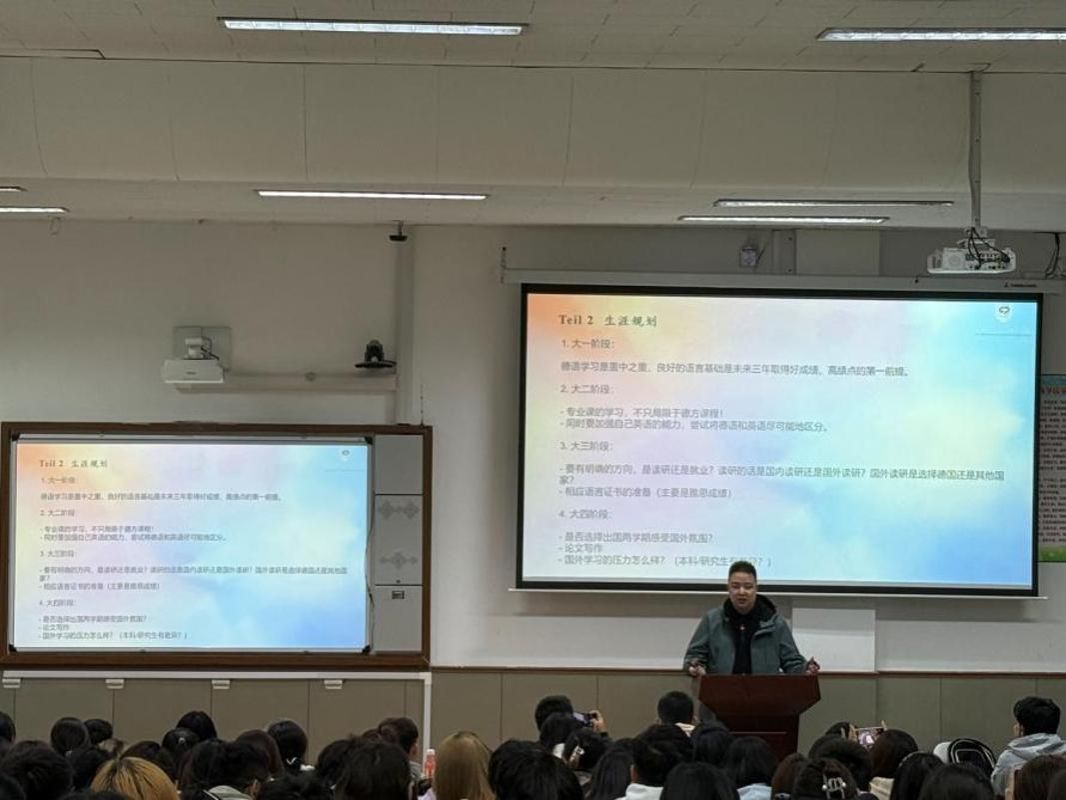 分享會上,劉一楠以自身求學(xué)經(jīng)歷為切入點(diǎn),系統(tǒng)拆解了中德四年的學(xué)習(xí)脈絡(luò):大一作為德語學(xué)習(xí)的基礎(chǔ)階段至關(guān)重要;大二階段進(jìn)入專業(yè)課學(xué)習(xí),分為中方課程與德方課程,需在適應(yīng)德語教學(xué)環(huán)境的同時,兼顧英語學(xué)習(xí),避免語言能力退化;大三是明確發(fā)展方向的關(guān)鍵期,需確定考研或就業(yè)路徑,尤其是留學(xué)所需的雅思成績,需盡早規(guī)劃備考;大四的德國交換學(xué)習(xí),不僅要完成課程任務(wù)與德文論文,更要珍惜跨文化交流機(jī)會,全方位體驗(yàn)德國的教育與生活。