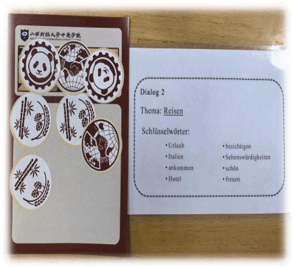 區(qū)域2的德語國(guó)家知識(shí)問答區(qū),印有國(guó)旗、地標(biāo)建筑的題卡引發(fā)熱烈討論,“哪個(gè)國(guó)家以黑森林蛋糕聞名?”“瑞士的官方語言有幾種?”同學(xué)們或托腮思索,或與同伴輕聲交流,每當(dāng)有人答對(duì)問題,外教便會(huì)遞上貼紙。通過這個(gè)游戲,大家對(duì)德語國(guó)家的了解更加深入,拓寬了國(guó)際視野,同時(shí)也鞏固了課堂上學(xué)到的相關(guān)知識(shí)。每答對(duì)一題,便能得到一個(gè)印章,這讓同學(xué)們?cè)诜e累知識(shí)的同時(shí),也收獲了滿滿的成就感。