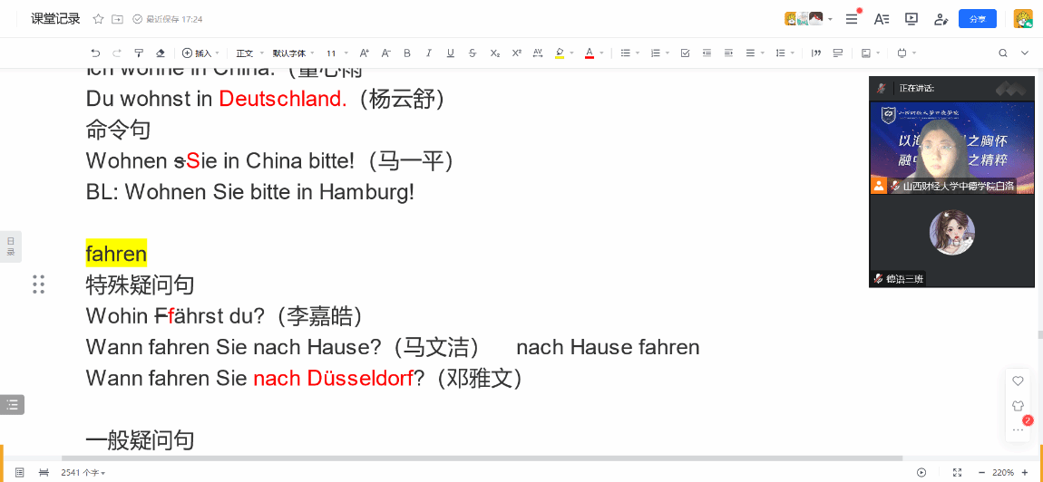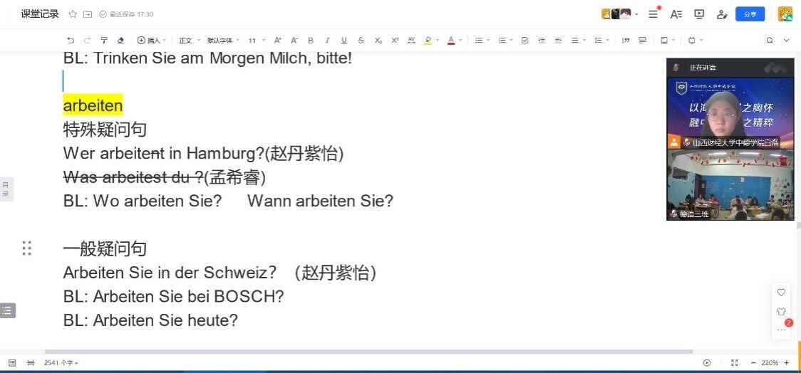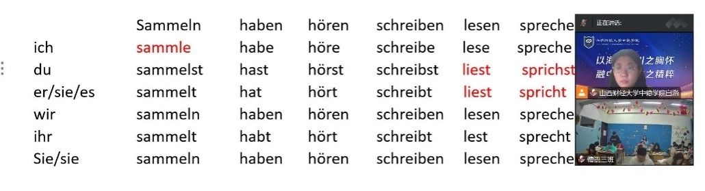 第三周的教學(xué)順利完成,我也積累了利用共享文檔展開線上教學(xué)的經(jīng)驗(yàn)。在今后的教學(xué)工作中,我會(huì)繼續(xù)嘗試新的教學(xué)方法和模式,探索新的教學(xué)輔助工具,不斷提高自己的教學(xué)能力。(德語教研室 白洛)