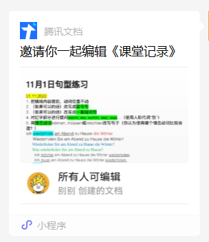 2. 通過共享文檔可以模擬教室里請(qǐng)學(xué)生在黑板上答題的環(huán)節(jié)。如默寫動(dòng)詞變位、聽寫單詞、做聽力練習(xí)等。其他同學(xué)觀看文檔幾乎與在教室里看黑板沒有差別。此外可以同時(shí)請(qǐng)幾位甚至全部同學(xué)答題,在檢驗(yàn)學(xué)習(xí)效果方面十分有效。