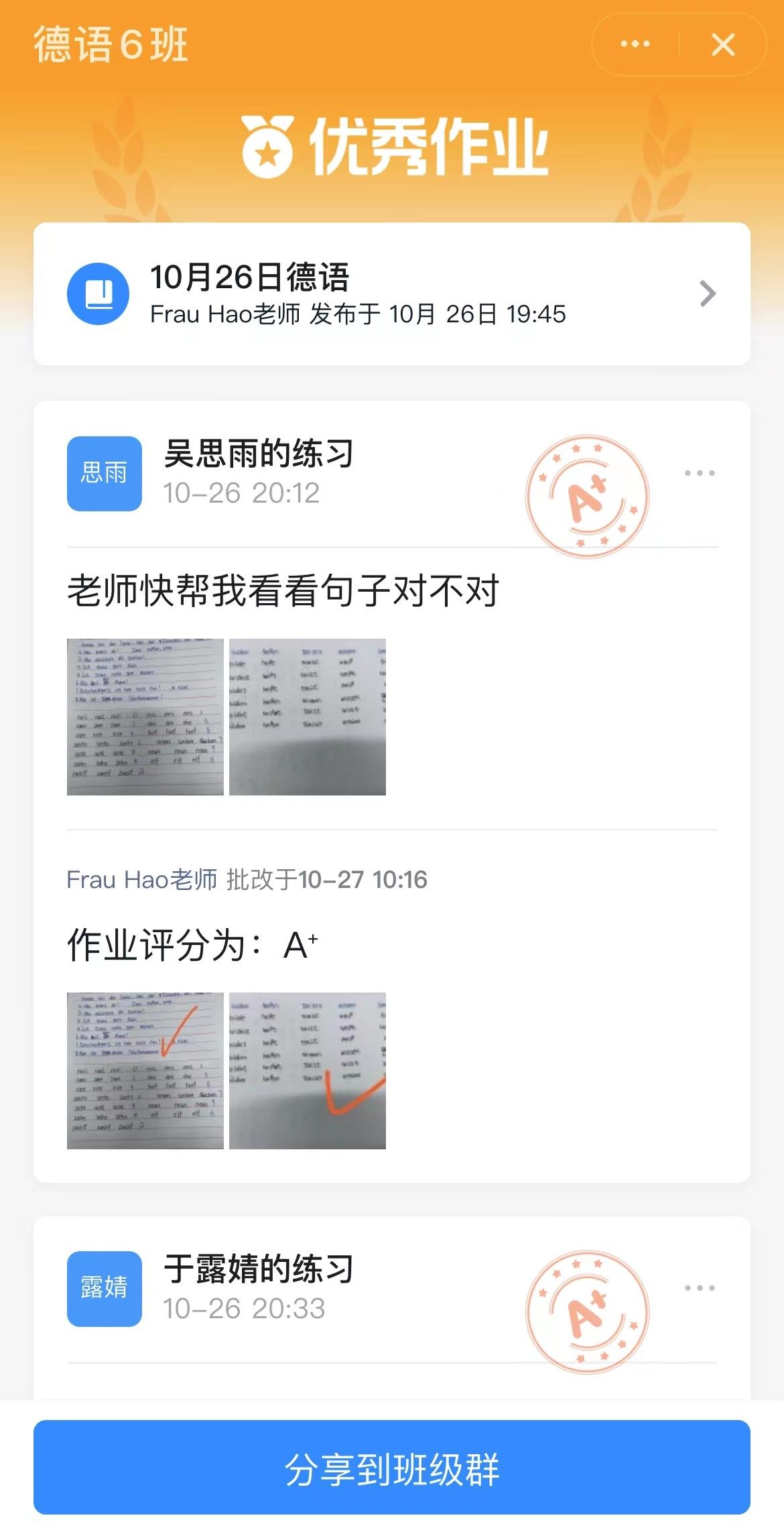 在平常的教學(xué)過程中為了做到及時(shí)批改作業(yè),查缺補(bǔ)漏,我們充分利用釘釘家校本以及微信群,既可以準(zhǔn)確統(tǒng)計(jì)交作業(yè)情況,也方便老師隨時(shí)檢查批閱。對(duì)于優(yōu)秀作業(yè),我們可以通過優(yōu)秀共享相互學(xué)習(xí)。為了保障學(xué)生早晚自習(xí)的學(xué)習(xí)效率,我們針對(duì)大二,大三的學(xué)生進(jìn)行了班助的選拔,針對(duì)答疑解惑,輔助老師完成每日教學(xué)起到了積極的推動(dòng)作用。