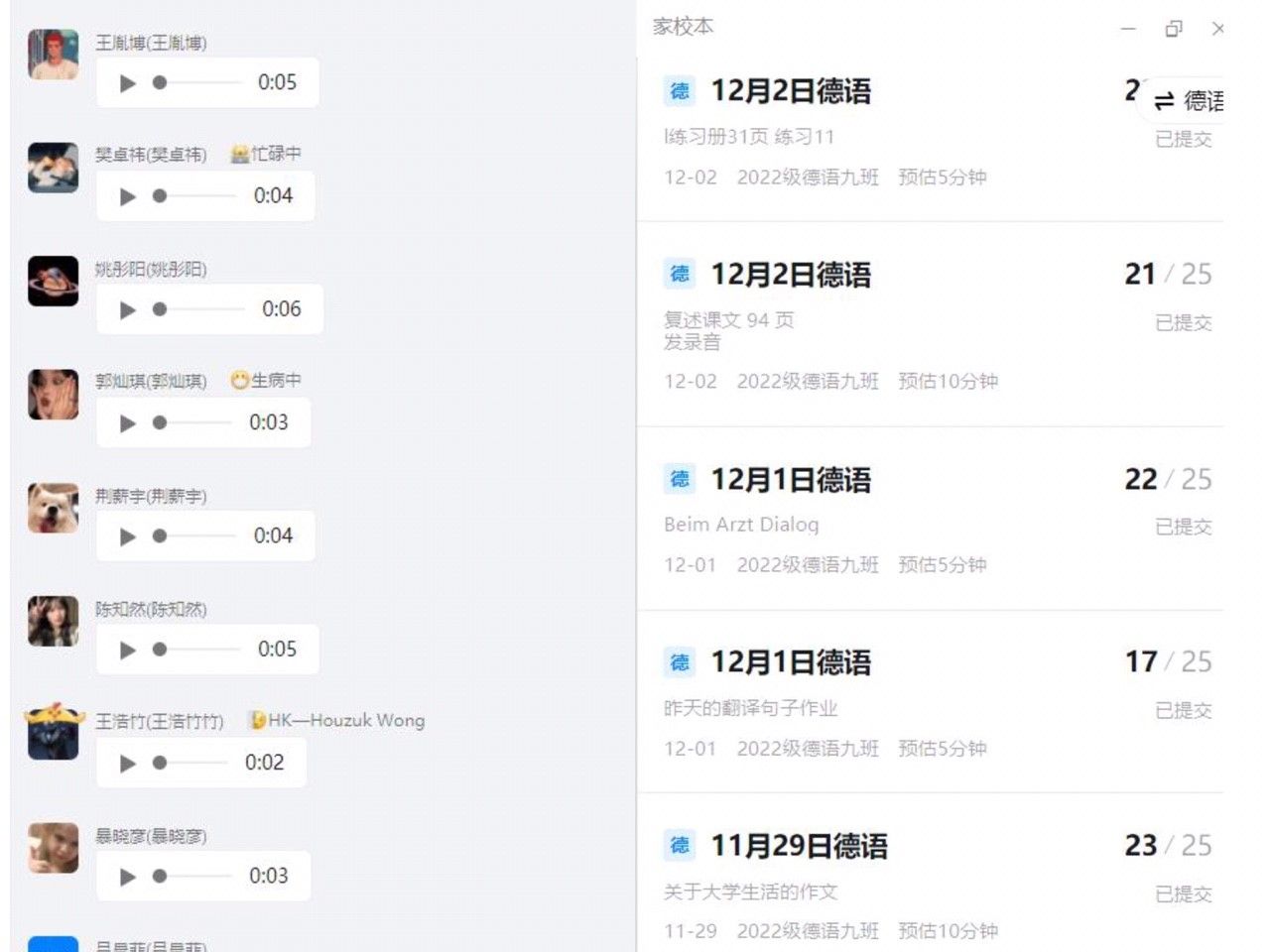 如何讓獨自在家上課的學生也愿意自覺開口說德語,這可能是多數(shù)老師面臨的挑戰(zhàn)。在講到重點單詞句型時,我會要求所有同學口頭造句,并且以語音的方式發(fā)送到釘釘班級群,然后當堂逐一點擊播放,讓所有同學都能聽到其他同學的句子。如果有錯誤,我會馬上糾錯,讓學生再次把正確的句子發(fā)送。另外每天我也會布置語音作業(yè),要求學生錄對話或者是復述課文到家校本。通過這樣課上課下的反復練習糾正,提高大家的口語表達能力。