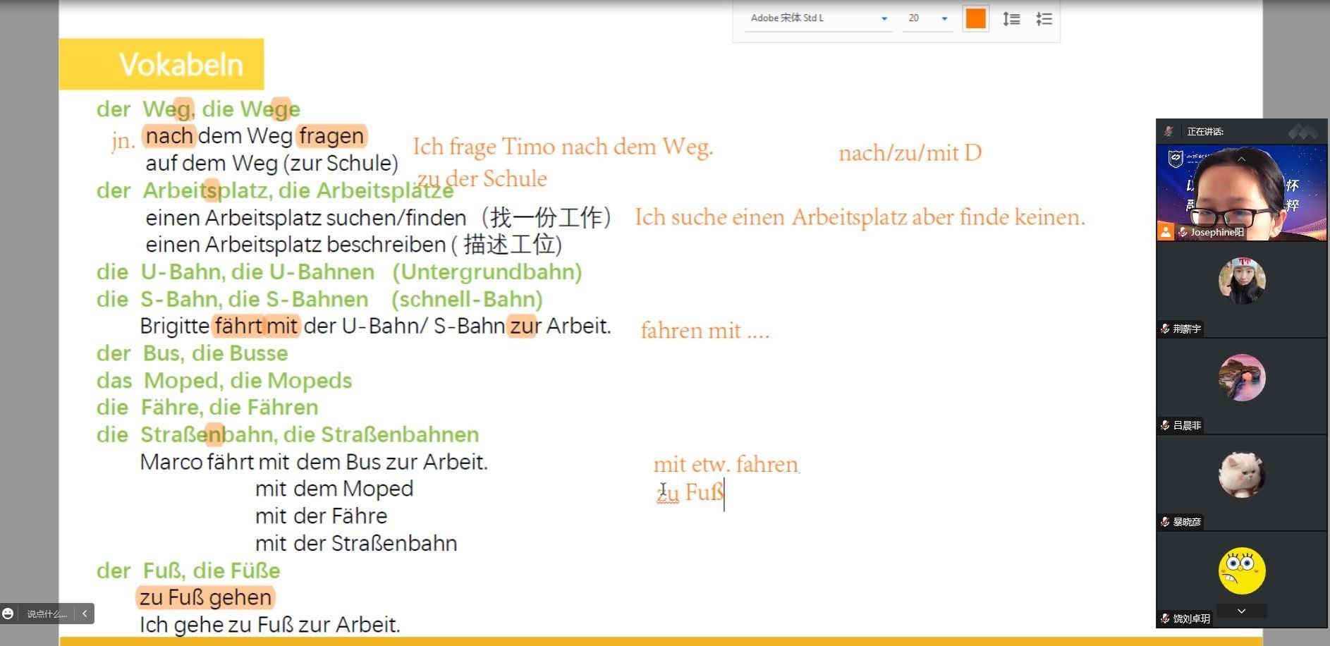 每天開始德語教學前,我會把本周已經(jīng)學過的單詞聽力給同學們播放一次,要求所有同學開攝像頭跟讀,營造良好的德語學習的氛圍,也提高了學生發(fā)音的準確性。