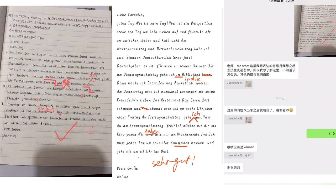 另外,來自大二大三的助教學姐在德語學習上也給了同學們很大的幫助,每天晚自習開始前我都會和助教們說一下今天復習內(nèi)容的重點,以及哪位同學的發(fā)音需要她們幫忙糾正,在她們的監(jiān)督和協(xié)助下,大家學習效率和效果都有了明顯的提升。