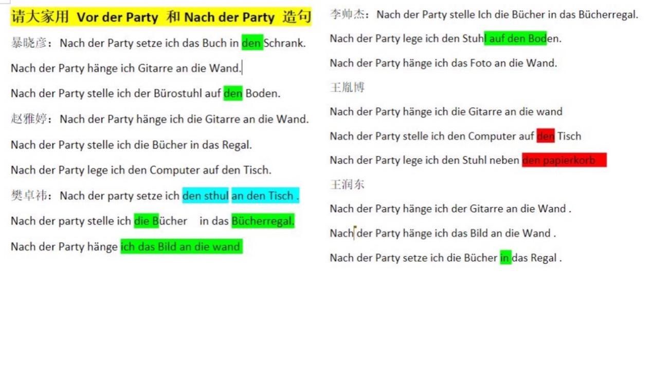 在課上講解重點單詞語法時,除了口頭造句外,我也會讓學生把自己造的句子寫出來發(fā)送到釘釘,這樣所有同學可以把所有的句子一起查看,發(fā)現(xiàn)錯誤立馬改錯。另外針對每課的話題我也定期布置寫作作業(yè),學生提交,我批閱之后選出優(yōu)秀作業(yè)課堂進行展示,針對某一個意思的不同表達大家也會展開熱烈討論,在這樣的過程中大家既提高了德語,也收獲了成就感。