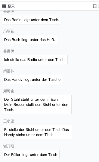 面對屏幕學(xué)習(xí)很辛苦,但是大家并不枯燥,每天會有各種不同的內(nèi)容及形式,有線上接龍游戲,有拍攝小視頻,有自我展示環(huán)節(jié)等等。每個(gè)單元還會有相對應(yīng)的對話視頻任務(wù)。在大家積極完成任務(wù)的同時(shí),德語水平也在不斷提高。