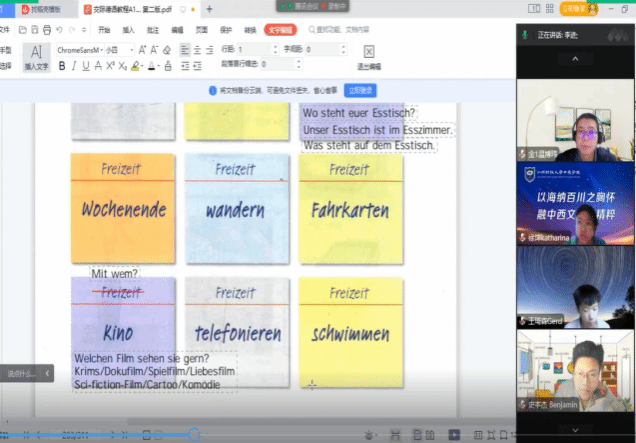 中德學院德語四班二零二二學年的第十七個教學周介于12.19-12.23日,28個課時,按既定教學計劃本周涉及Studio 21-A1-Einheit 8 - Berlin sehen (第8單元:看見柏林)。本周4班26位同學能全部按時到課,除個別同學因疫情影響身體不適請求不開攝像頭,但保證在課外,課上回應基本積極。但課后作業(yè)仍有個別補交、漏交及不交現(xiàn)象存在。