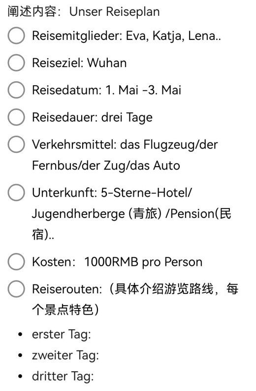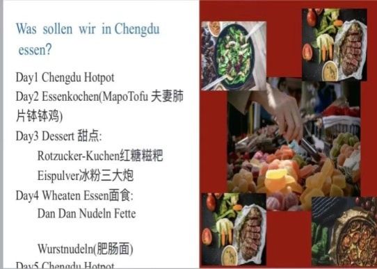隨著一步步深入學(xué)習(xí)德語,也隨著課業(yè)的一步步推進,大家也感覺到了學(xué)習(xí)德語的壓力,為了提高同學(xué)們學(xué)習(xí)德語的積極性,也為了進一步夯實同學(xué)們目前所學(xué),課程之余圍繞“外出主題”,我們分組進行了Mein Reiseplan活動,給同學(xué)們提供豐富的校園生活,陪伴著學(xué)生共同進步。