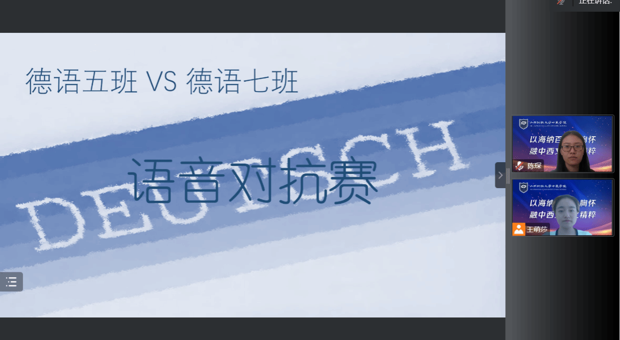 根據(jù)進(jìn)度安排,教學(xué)第一周、第二周為語音學(xué)習(xí)階段,為測試本階段學(xué)習(xí)效果,使同學(xué)們相互了解、共同進(jìn)步,陳琛老師、王萌莎老師帶領(lǐng)德語五班,德語七班于2022年10月21日開展了一場別開生面的語音對抗賽,五班、七班共50名同學(xué)參與其中,兩位老師線上指導(dǎo)。