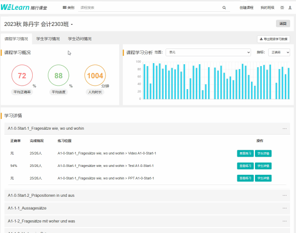 王秀娟副院長(zhǎng)首先代表學(xué)院對(duì)陳丹宇老師的講解表示歡迎和感謝。隨后陳丹宇老師就雙方均使用的《studio 21交際德語(yǔ)教程》(第二版)教材中涉及A1階段語(yǔ)法的學(xué)習(xí)與操練在上外社App WE learn中的應(yīng)用、其主要功能及她們團(tuán)隊(duì)在開(kāi)發(fā)此微課應(yīng)用的初衷和使用后的效果等方面做了逐一的介紹。面對(duì)課時(shí)緊、德語(yǔ)語(yǔ)法龐雜、教材無(wú)法完全覆蓋、補(bǔ)充講解占用課時(shí)多等一直存在的問(wèn)題,她們通過(guò)PPT+講稿+練習(xí)+視頻的方式將語(yǔ)法教學(xué)內(nèi)化到課前自學(xué)環(huán)節(jié)和課上檢查答疑的過(guò)程中,針對(duì)教材中每個(gè)語(yǔ)法知識(shí)點(diǎn)共約15分鐘的學(xué)習(xí)時(shí)長(zhǎng)讓學(xué)生在學(xué)中體會(huì),用中加深,講中掌握,以引導(dǎo)學(xué)生語(yǔ)法的習(xí)得。此微課應(yīng)用不僅促進(jìn)學(xué)生自主學(xué)習(xí)的習(xí)慣養(yǎng)成,教師也可通過(guò)后臺(tái)數(shù)據(jù)建立學(xué)生學(xué)習(xí)臺(tái)賬,使教學(xué)更加可視化,以更好提高課堂效率。陳老師坦言,通過(guò)一年多來(lái)的試用,深感對(duì)教學(xué)促進(jìn)不少。