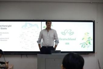 隨后在第二環(huán)節(jié),助教Julian Leon Neuhaus上臺為大家?guī)砹司实牡聡榻B。從德國的歷史、地理、風土人情到美食、音樂、藝術(shù),其用生動的語言和豐富的圖片,讓在場的每一位同學(xué)都仿佛置身于德國的大街小巷,感受到了德國的獨特魅力。