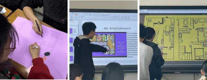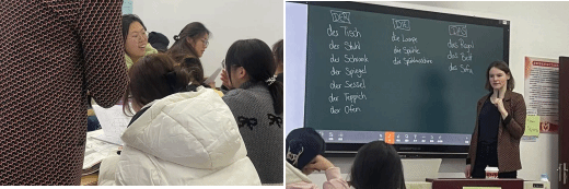每周的教學(xué)過(guò)程中都有學(xué)生和德國(guó)外教交流的時(shí)間和機(jī)會(huì)。本周外教進(jìn)班期間,重點(diǎn)對(duì)口語(yǔ)和詞匯進(jìn)行了練習(xí),外教Frau Steiner在授課過(guò)程中介紹了幾種詞匯練習(xí)方式,如按照詞性將同一主題下的詞匯歸類(lèi),按照可搭配動(dòng)詞將詞匯歸類(lèi)記憶等方法。既讓學(xué)生多次反復(fù)記憶單詞,又能為學(xué)生之后詞匯的學(xué)習(xí)提供可行思路。在口語(yǔ)練習(xí)中,外教以“討論+作畫(huà)”的方式,新穎而生動(dòng)地讓學(xué)生掌握句型和詞匯,受到了學(xué)生的認(rèn)可和歡迎。