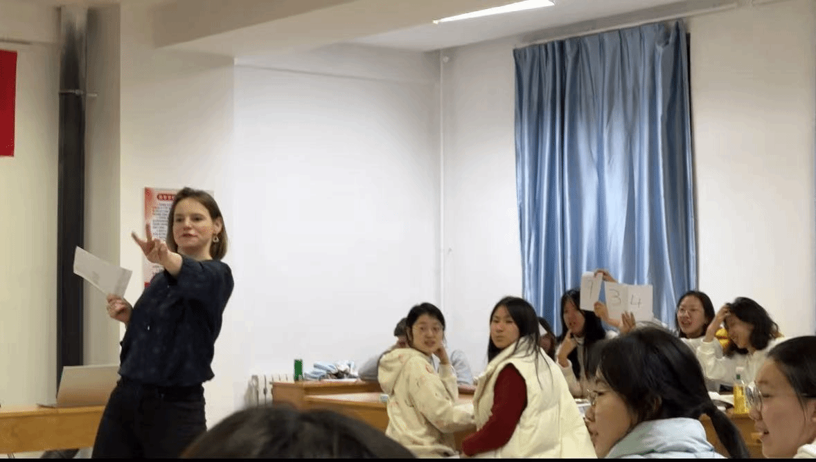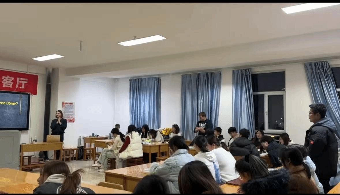 本次活動(dòng)共分為三個(gè)環(huán)節(jié)。第一個(gè)環(huán)節(jié),Janika Steiner老師將歐洲地圖按照國(guó)家分為若干個(gè)板塊,通過(guò)圖片向同學(xué)們分別介紹了德國(guó)、比利時(shí)、意大利、西班牙、瑞典、奧地利、匈牙利和土耳其等多個(gè)國(guó)家的特色美食。在這個(gè)過(guò)程中同學(xué)們不僅對(duì)歐洲各國(guó)的食物有了進(jìn)一步的了解,還積累了食材相關(guān)的詞匯。之后還設(shè)置了問(wèn)答環(huán)節(jié),加深了同學(xué)們對(duì)德國(guó)食品文化知識(shí)的印象。