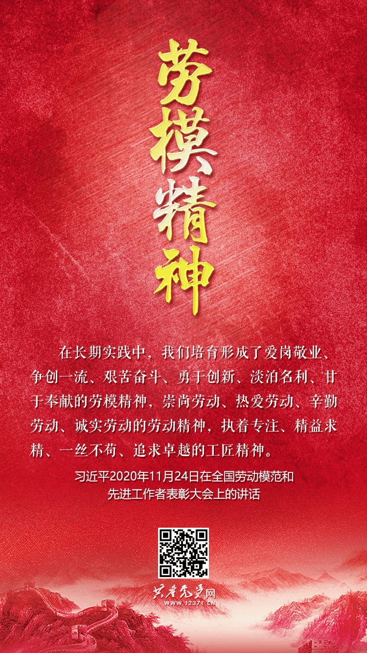 廣大勞模鑄就的勞模精神,生動(dòng)詮釋了中國(guó)人民具有的偉大創(chuàng)造精神、偉大奮斗精神、偉大團(tuán)結(jié)精神、偉大夢(mèng)想精神,充分彰顯了以愛(ài)國(guó)主義為核心的民族精神和以改革創(chuàng)新為核心的時(shí)代精神,是中國(guó)共產(chǎn)黨人精神譜系的重要組成部分。